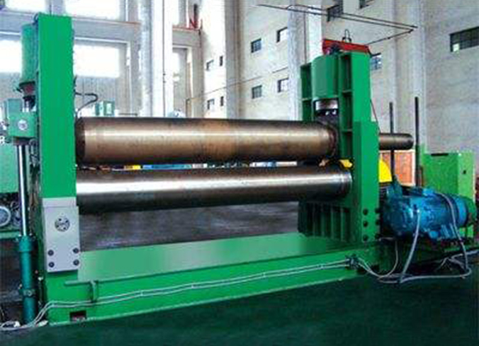 本機結構型式為三錕對稱式,上輥在兩下輥中央對稱位置作垂直升降運動,通過液壓缸內的液壓油作用于活塞而獲得,為液壓傳動;兩下作旋轉運動,通過減速機的輸出齒輪與下輥齒輪嚙合為卷制板材提供扭矩。本機床結構緊,操作維修方便。